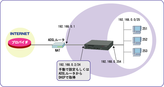F200を設置する場合の例です。 FITELnet F200のEWAN側のアドレスは,手動でアドレスを設定することもADSLルータからDHCPで受け取ることもできます。ただし,EWAN側アドレスとLAN側アドレスは同じアドレスをふることができませんの,LAN側には違うアドレスをふってください。