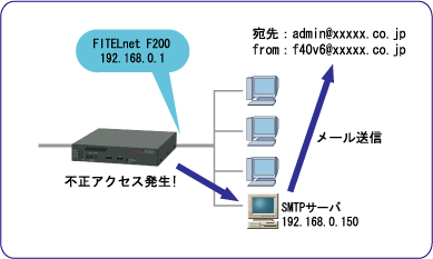 本装置に対してTELNETやFTPでアクセスする際、パスワードを規定回数以上誤った場合に不正アクセスとみなし、指定した宛先に電子メールにて通知する機能です。