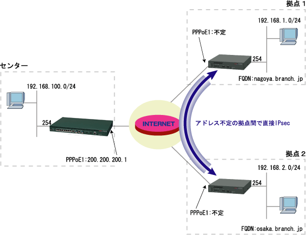 ダイナミックDNS機能を使用して、アドレス不定の拠点間で直接IPsec通信を行なう。