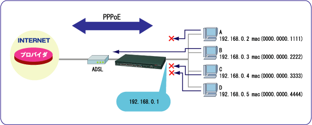 MACアドレス(0000.0000.2222)からのパケットのみ中継するという形態を考えます。