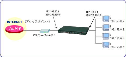| LAN側IPアドレス | LANインタフェース設定モード | ip address | LAN側IPアドレスサブネットマスク | 192.168.0.1 255.255.255.0 |