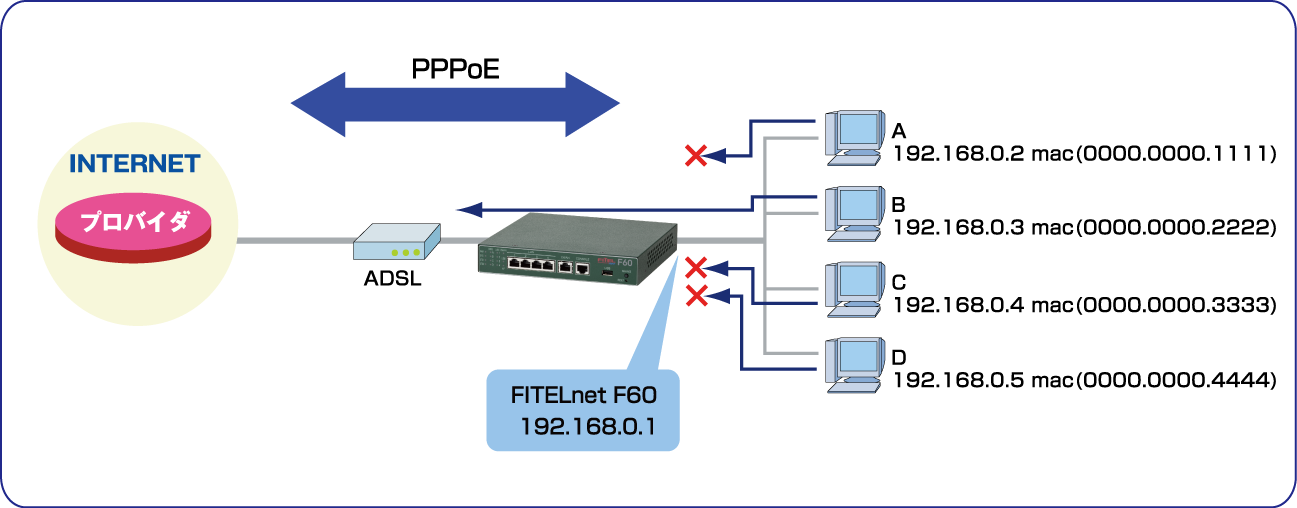 MACアドレス(0000.0000.2222)からのパケットのみ中継するという形態を考えます。