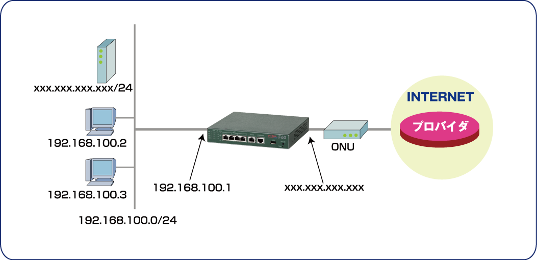 | LAN側IPアドレス | LANインタフェース設定モード | ip address | LAN側IPアドレスサブネットマスク | 192.168.100.1 255.255.255.0 |