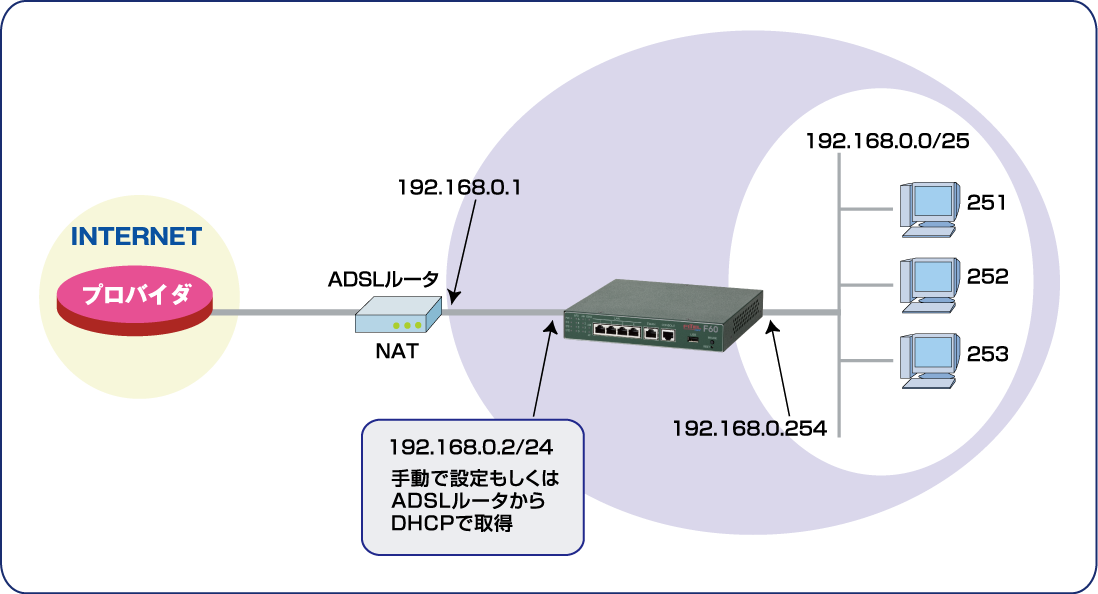 F60を設置する場合の例です。 FITELnet F60のEWAN側のアドレスは,手動でアドレスを設定することもADSLルータからDHCPで受け取ることもできます。ただし,EWAN側アドレスとLAN側アドレスは同じアドレスをふることができませんの,LAN側には違うアドレスをふってください。