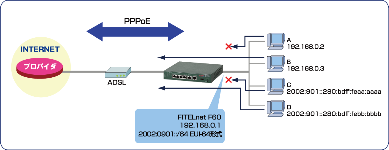 192.168.0.100からのパケット、2002:901::280:bdff:feaa:aaaaからのパケットを中継しないという形態を考えます。