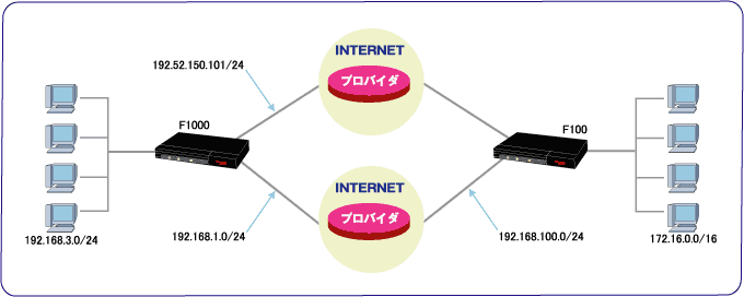 1.F100(PPPoEとEWANの2回線)、F1000×1台でIPsec負荷分散を行う