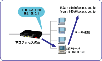 本装置に対して、TELNETやFTPでアクセスする際、パスワードを規定回数以上誤った場合、不正アクセスとみなし、指定した宛先に電子メールにて通知する機能です。