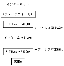 上記構成の場合、FITELnet-F40(B)で vpnparam tunnelroute=on に設定します。(併せて、nexthop または nextif の設定が必要です)