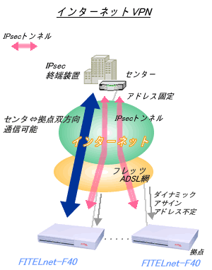 FITELnet-F40は、IPsec Aggressive Modeをサポートしており、フレッツADSLの一般的な契約である「アドレス不定」でもVPN(IPsec)の通信が実現でき、通信ランニングコストを削減することができます。