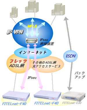 IPsecでの高いスループット多くの導入実績・ノウハウ、高い相互接続性の実績のあるIPsec技術を搭載。また暗 号化、復号化に専用のチップを用いることにより、IPsec動作時でもADSLの速度を 損なわないスループットを実現します。冗長構成サポートISDN対応ルータFITELnet-E30との組み合わせで冗長構成を実現。 ADSL網ダウンでもネットワークの停止を防ぎます。様々なネットワーク用件に対応マルチルーティング、PKI※もサポートしています。※PKIはオプションでご提供 IPsec フレッツADSL