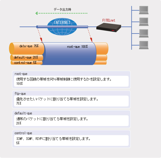 | root-que | 使用する回線の帯域を何%帯域制御に使用するかを設定します。 100% |