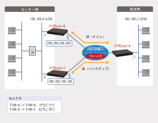 FITELnet-F100の場合、V01.07以降のファームウェアで設定できます。 FITELnet-F1000は、最初のファームウェアV01.00から設定できます。 この設定により、バックアップ通信に切り替わった場合でも、常にSAを確立した状態を維持できるようになり、センター契機の通信にも対応できます。 |