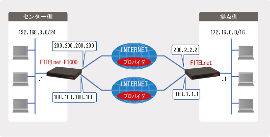 F100ではV01.10以降、F1000ではV01.03以降のファームウェアから、どちらかの比率を0に設定できるようになりました。 負荷分散の比率は送信方向のパケットに対してのみ機能します。(受信方向の分散比率はセンタ側で行ってください) センタ側と拠点側で分散比率を合わせる必要はありません。 |