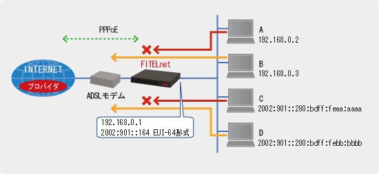 192.168.0.2からのパケット、2002:901::280:bdff:feaa:aaaa からのパケットを、中継しないという形態を考えます。