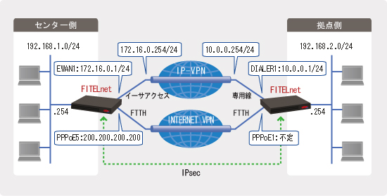 拠点は専用線で、また、センターはイーサアクセスでIP-VPNに接続しており、センターと拠点は、正常時はIP-VPNを使って平文で通信を行います。