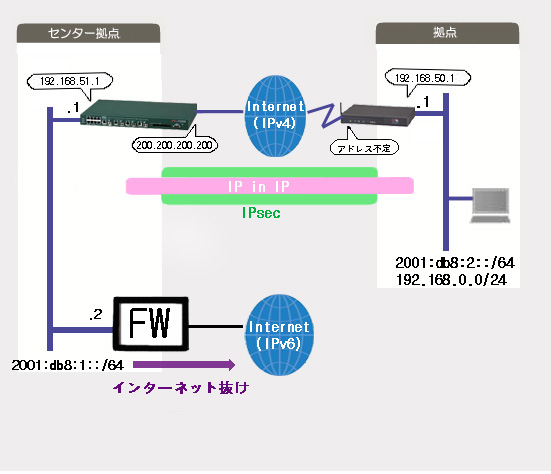 拠点間を IP in IP で接続して、拠点のIPv6インターネットアクセスをセンター拠点経由で行う例です。