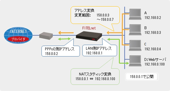 NAT変換スタティックの変換後アドレス:192.168.0.100⇔158.0.0.1