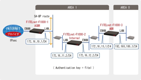 ! ! ! 特権ユーザモードに移行します。 ! Router> enable Enter password: super ←パスワードを入力します。(実際は表示されない) ! Router# ! ! ! 基本設定モードに移行します。 ! Router# configure terminal Router(config)# ! ! ! LAN側IPアドレスを設定します。 ! Router(config)# interface lan 1 Router(config-if lan 1)# linkdown-detect on *1 Router(config-if lan 1)# ip address 172.16.10.1 255.255.255.0 Router(config-if lan 1)# ip ospf authentication-key fitel Router(config-if lan 1)# exit ! ! ! ループバックインタフェース設定モードに移行します。 ! Router(config)# interface loopback 1 Router(config-if loopback 1)# ip address 1.1.1.1 Router(config-if loopback 1)# exit ! ! ! OSPFの設定をします。 ! Router(config)# router ospf Router(config-ospf)# area 1 authentication Router(config-ospf)# network 1.1.1.1 0.0.0.0 area 1 Router(config-ospf)# network 172.16.10.0 0.0.0.255 area 1 Router(config-ospf)# redistribute local-prot1 ! ↑SA-UPルートを参照して下さい。 Router(config-ospf)# router-id 1.1.1.1 Router(config-ospf)# exit Router(config)# end ! ! ! 設定を保存します。 ! Router# save SIDE-A.cfg % saving working-config % finished saving Router# ! ! ! 設定を有効にするために再起動します。 ! Router# reset Are you OK to cold start?(y/n) y