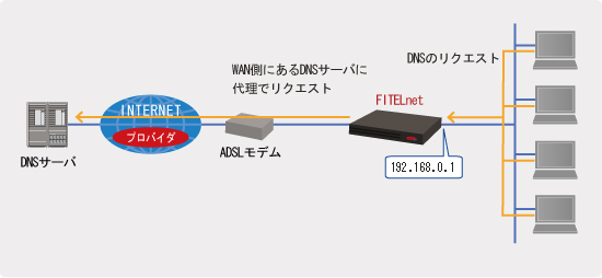 IPv4/IPv6の双方で簡易DNS機能(FITELnet-F100を擬似的にDNSサーバとして使用する機能)を使用するケースを考えます。