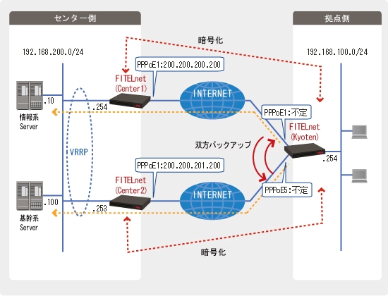 構成例では、「情報系サーバ宛」「基幹宛てサーバ宛」を宛先IPアドレスで識別しています。アクセスリストで識別できるポリシーであれば、2つのポリシーを負荷分散、バックアップの構成をとることができます。センターはVRRPにより機器冗長構成をとっています。