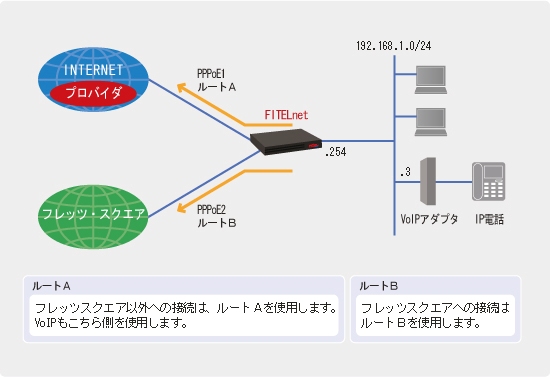 フレッツ・スクウェア以外への接続は、ルートAを使用します。 VoIPもこちら側を使用します。 |