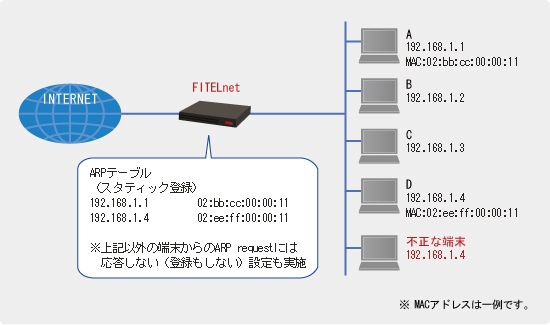 ! ! 192.168.1.1の端末のARPを静的に設定します ! Router(config)# ip arp static 192.168.1.1 02bb.cc00.0011 ! ! 192.168.1.4の端末のARPを静的に設定します ! Router(config)# ip arp static 192.168.1.4 02ee.ff00.0011 Router(config)# interface lan 1 ! ! 受信したARPにより、ARPテーブルを登録しない様にします ! Router(config-if lan 1)# ip arp learning disable ! ! ARPテーブルに登録されている端末からのARPリクエストのみ応答する ! Router(config-if lan 1)# ip arp reply authorized ! ! 設定外の端末との通信を行わないためARPリクエストの送信を停止します(任意) ! Router(config-if lan 1)# ip arp request disable Router(config-if lan 1)# exit Router(config)# end