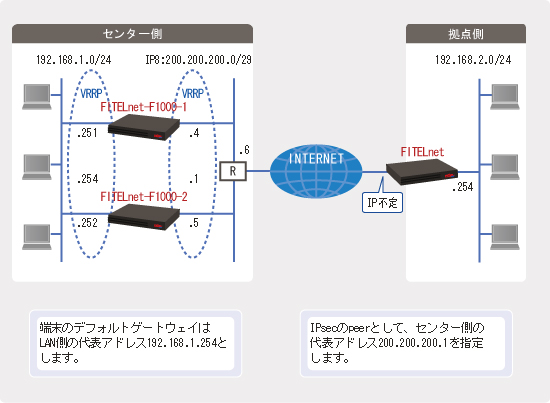 ! ! ! 特権ユーザモードに移行します。 ! Router> enable Enter password: super ←パスワードを入力します(実際は何も表示されません)。 Router# ! ! ! 基本設定モードに移行します。 ! Router# configure terminal Router(config)# ! ! ! VRRP 機能を有効にします。 ! Router(config)# ip vrrp enable ! ! ! LAN 1 インタフェースの設定を行います。*1 ! Router(config)# interface lan 1 Router(config-if lan 1)# ip address 192.168.1.251 255.255.255.0 Router(config-if lan 1)# vrrp 1 address 192.168.1.254 ! VRID を 1 として、代表 IP アドレスを設定します。 Router(config-if lan 1)# vrrp 1 priority 254 ! バックアップ側より優先度を高く設定します。 ! (数字が大きいほど優先度は高くなります) Router(config-if lan 1)# exit ! ! ! EWAN 1 インターフェースの設定を行います。 ! Router(config)# interface ewan 1 Router(config-if ewan 1)# ip address 200.200.200.4 255.255.255.248 Router(config-if ewan 1)# vrrp 1 address 200.200.200.1 Router(config-if ewan 1)# vrrp 1 priority 254 ! VRID を LAN 側と同じにして、動作を同期させます。 Router(config-if ewan 1)# crypto map kyoten Router(config-if ewan 1)# exit ! ! ! デフォルトルートを設定します。 ! Router(config)# ip route 0.0.0.0 0.0.0.0 200.200.200.6 ! ! ! IPsec の各種設定をします。 ! Router(config)# vpn enable Router(config)# vpnlog enable ! Router(config)# crypto isakmp policy 1 Router(config-isakmp)# authentication prekey Router(config-isakmp)# encryption aes 128 Router(config-isakmp)# group 2 Router(config-isakmp)# hash sha Router(config-isakmp)# keepalive always-send Router(config-isakmp)# key ascii VPN Router(config-isakmp)# negotiation-mode aggressive Router(config-isakmp)# peer-identity host F100kyoten Router(config-isakmp)# source-interface ewan 1 vrid 1 ! 代表アドレスを使って SA を確立するようにします。 Router(config-isakmp)# exit ! Router(config)# ipsec transform-set P2-POLICY esp-aes-128 esp-sha-hmac ! Router(config)# ipsec access-list 1 ipsec ip 192.168.1.0 0.0.0.255 192.168.2.0 0.0.0.255 Router(config)# ipsec access-list 64 bypass ip any any ! Router(config)# crypto map kyoten 1 Router(config-crypto-map)# match address 1 Router(config-crypto-map)# set peer host F100kyoten Router(config-crypto-map)# set transform-set P2-POLICY Router(config-crypto-map)# exit ! ! ! 特権ユーザモードに戻ります。 ! Router(config)# end ! ! ! 設定を保存します。 ! Router# save SIDE-A.cfg % saving working-config % finished saving Router# ! ! ! 設定を有効にするために再起動します。 ! Router# reset Are you OK to cold start?(y/n) y