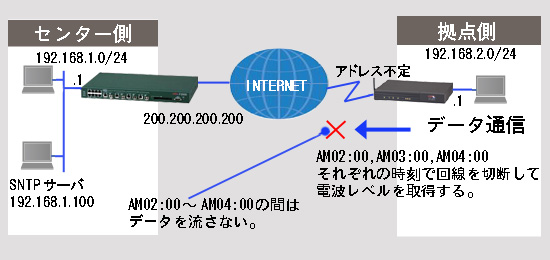 AM02:00、AM03:00、AM04:00 それぞれの時刻で回線を切断して、電波状態の監視を行う例です。