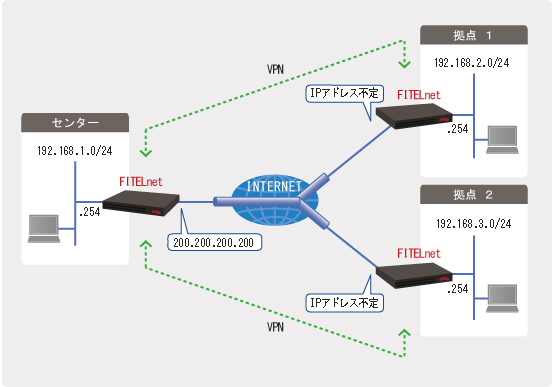 センターを経由してワイヤレス接続の拠点間でIPsec通信を行う例です。