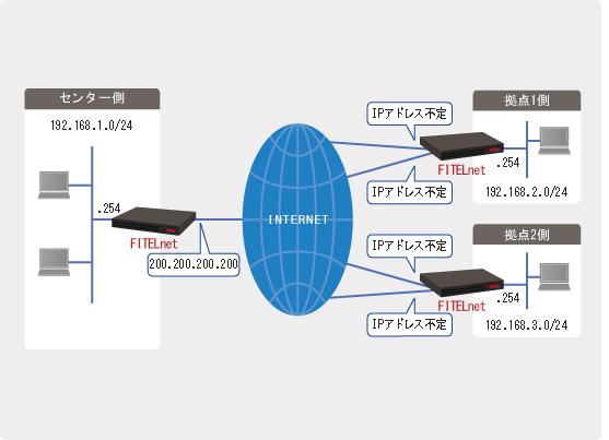 | 拠点2 | F140 LAN インタフェース IP アドレス | 192.168.3.254/24 | ||