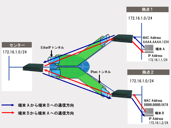 EtherIPの設定情報を表示 MACアドレス学習が有効になっているかを確認 トンネルインタフェース間の中継が有効になっているかを確認 |