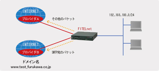 ! ! ! 特権ユーザモードに移行します。 ! Router> enable Enter password: super ←パスワードを入力します。(実際は表示されない) Router# ! ! ! 基本設定モードに移行します。 ! Router# configure terminal Router(config)# ! ! ! LAN側IPアドレスを設定します。 ! Router(config)# interface lan 1 Router(config-if lan 1)# ip address 192.168.100.254 255.255.255.0 Router(config-if lan 1)# exit ! ! ! アクセスリストでNAT対象とするアドレス範囲を指定します。 ! Router(config)# access-list 1 permit 192.168.100.0 0.0.0.255 ! ! ! PPPoEの各種設定をします。 ! Router(config)# interface pppoe 1 Router(config-if pppoe 1)# ip nat inside source list 1 interface Router(config-if pppoe 1)# pppoe server A-Provider Router(config-if pppoe 1)# pppoe account user-A@xxxx.ne.jp secret-A Router(config-if pppoe 1)# pppoe type host Router(config-if pppoe 1)# exit Router(config)# Router(config)# interface pppoe 2 Router(config-if pppoe 2)# ip nat inside source list 1 interface Router(config-if pppoe 2)# pppoe server B-Provider Router(config-if pppoe 2)# pppoe account user-B@xxxx.ne.jp secret-B Router(config-if pppoe 2)# pppoe type host Router(config-if pppoe 2)# exit ! ! ! デフォルトルートをPPPoE1に向けます。 ! Router(config)# ip route 0.0.0.0 0.0.0.0 pppoe 1 ! ! ! 本装置で、DNSリゾルバを動作させる場合に、proxy-dns機能を利用するためDNSサーバのIPアドレスを本装置宛に設定します。 ! Router(config)# ip name-server 127.0.0.1 ! ! DNSリゾルバのリトライ間隔を設定します。 ! Router(config)# ip resolver-retries 0 interval 1 request-timeout 2 timeout 2 ! ! ProxyDNS 機能を利用する設定をします。 ! Router(config)# proxydns mode v4 ! ! proxyDNS機能により解決した情報を内部のテーブルに保持しておく時間を設定します。 ! Router(config)# proxydns default cache-time 60 ! ! ! アクセスリストでポリシールーティングの対象とするパケットを指定します。 ! 宛先はドメイン名のリストを指定します。 ! Router(config)# access-list 100 permit tcp any fqdn-list 1 eq smtp ! ! アクセスリストでポリシールーティングの対象とする宛先を指定します。 ! Router(config)# fqdn-list 1 www.test_furukawa.co.jp ! ! ! クラスマップでパケットの分類を行います。 ! Router(config)# class-map MAIL-class Router(config-class-map)# match ip access-group 100 Router(config-class-map)# exit Router(config)# ! ! ! アクションマップで next hop の指定を行います。 ! Router(config)# action-map MAIL-action Router(config-action-map)# set ip next-hop pppoe 2 Router(config-action-map)# exit Router(config)# ! ! ! ポリシーマップでクラスマップとアクションマップの結び付けを行うことにより、 ! 分類したパケットの next hop を指定します。 ! Router(config)# policy-map MAIL-policy Router(config-policy-map)# class MAIL-class action MAIL-action Router(config-policy-map)# exit Router(config)# ! ! ! ポリシーマップをインターフェースに適用します。 ! ポリシールーティングは入ってくるパケットに対して適用されますので、 ! 入力側のインターフェースで入ってくるパケットに対してポリシーマップを適用します。 ! Router(config)# interface lan 1 Router(config-if lan 1)# service-policy input MAIL-policy Router(config-if lan 1)# exit ! ! 特権ユーザモードに戻ります。 ! Router(config)# end ! ! ! 設定を保存します。 ! Router# save SIDE-A.cfg % saving working-config % finished saving Router# ! ! ! 設定を有効にするために再起動します。 ! Router# reset Are you OK to cold start?(y/n) y