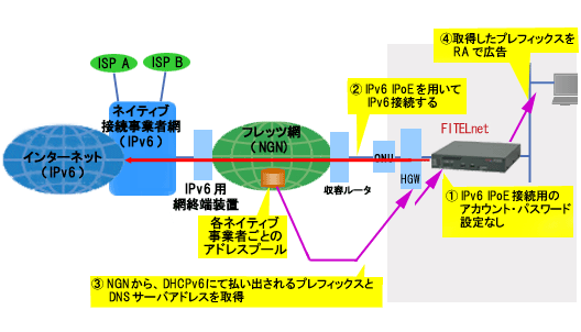 ! ! ! 特権ユーザモードに移行します。 ! Router> enable Enter password: Router# ! ! ! 基本設定モードに移行します。 ! Router# configure terminal Router(config)# ! ! ! IPv6通信時のネクストホップはewan 1インタフェース(IPv6 IPoE)とします 。 ! Router(config)#! Router(config)#ipv6 route ::/0 ewan 1 ! ! ! ewan 1インタフェース設定モードに移行します 。 ! DHCPv6クライアント機能を動作させるための設定です。 ! Router(config)#interface ewan 1 Router(config-if ewan 1)# ipv6 enable Router(config-if ewan 1)# ipv6 dhcp client client_name Router(config-if ewan 1)#exit ! ! ! lan 1インタフェース設定モードに移行します 。 ! DHCPv6-PDで取得したIPv6プレフィックスからIPv6アドレスを自動生成します。 ! また、RA送信、およびDHCPv6サーバ機能を動作させる設定です。 ! Router(config)#interface lan 1 Router(config-if lan 1)# ipv6 enable Router(config-if lan 1)# ipv6 address address-pool POOL1 prefix-length 64 Router(config-if lan 1)# ipv6 nd other-config-flag ! IPv6アドレス設定以外のオプション情報をホストに自動的に取得させます 。 Router(config-if lan 1)# ipv6 nd send-ra Router(config-if lan 1)# ipv6 dhcp server ipv6dns_server Router(config-if lan 1)#exit ! ! ! address-pool設定モードに移行します 。 ! DHCPv6-PDで取得したIPv6プレフィックスを利用するための設定です。 ! Router(config)#address-pool ipv6 POOL1 Router(config-address-pool-ipv6)# address-pool enable Router(config-address-pool-ipv6)# allocate prefix-length 64 Router(config-address-pool-ipv6)#exit ! ! ! ipv6 dhcp client-profile設定モードに移行します 。 ! DHCPv6-PDでIPv6プレフィックスとDNSサーバアドレスを取得するための設定です。 ! Router(config)#ipv6 dhcp client-profile client_name Router(config-ipv6-dhcp-client-prof)# option-request prefix-delegation delegates address-pool POOL1