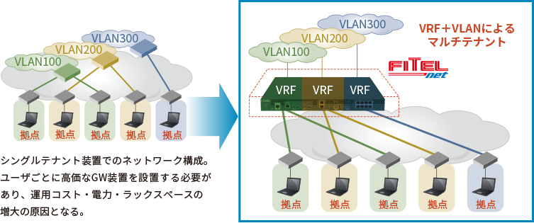複数のテナントユーザを、独立したVRFやVLAN毎に収容することでマルチテナント収容が可能です。ユーザトラフィックを収容するトンネルとして、IPsecトンネル、EtherIPやL2TPv3などのL2トンネルが選択でき、多彩なネットワーク構築が可能です。