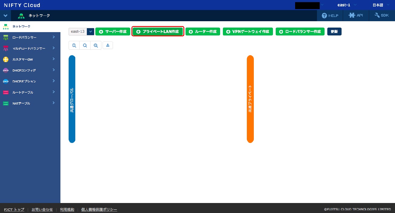 プライベート LAN を作成します。ニフクラコントロールパネルより、”プライベート LAN作成” をクリックします。