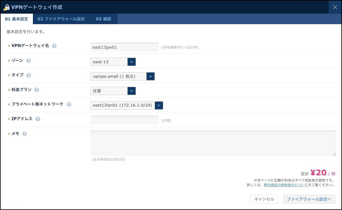 環境にあったパラメータを入力し、”ファイアウォール設定へ” をクリックします。