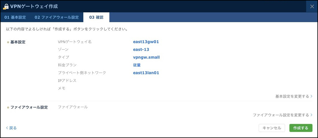 プライベート LAN CIDR など、各パラメータを入力し、”確認へ” をクリックします。