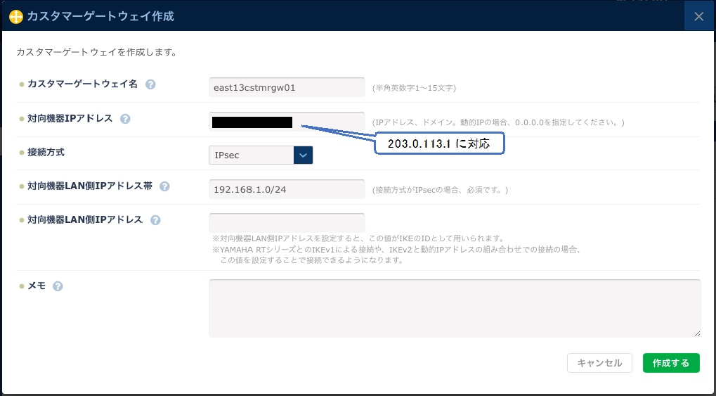 対向機器 IP アドレス、接続方式: IPsec、対向機器 LAN 側 IP アドレス帯など、各パラメータを入力し、”作成する” をクリックします。