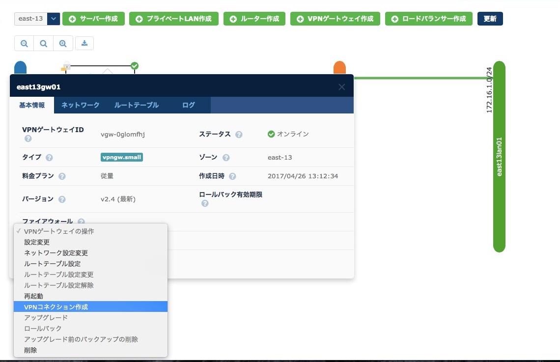 ニフクラコントロールパネルより、VPN ゲートウェイをクリックし、”VPN コネクション作成” をクリックします。
