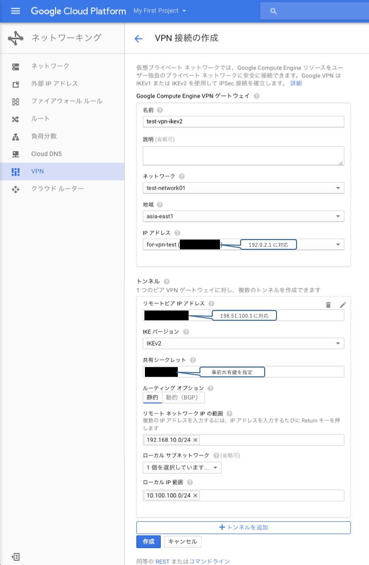 Cloud VPN gateway に割り当てるグローバル IP を取得しておきます。