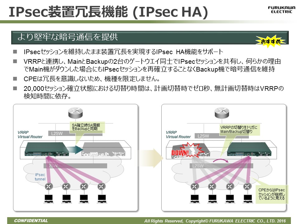 IPsecセッションを維持したまま装置冗長を実現するIPsec HA機能をサポート