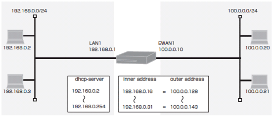 interface ewan 1 ip mtu 1500 ip address 100.0.0.10 255.255.255.0 ip nat inside source static-subnet 192.168.0.16 100.0.0.128 255.255.255.240 exit interface lan 1 ip address 192.168.0.1 255.255.255.0 exit service dhcp-server ip dhcp pool lan 1 default-router 192.168.0.1 exit end