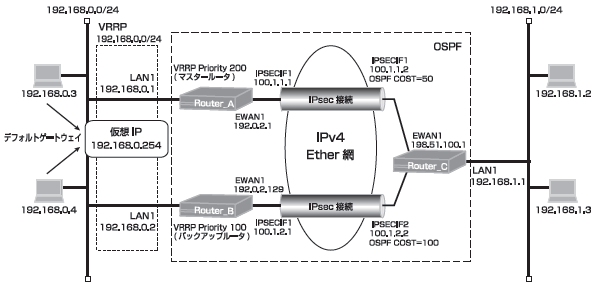 ip route 192.168.1.0 255.255.255.0 192.168.0.2 20 ip route 198.51.100.1 255.255.255.255 192.0.2.2 ip vrrp enable vpn enable vpnlog enable ipsec access-list 1 ipsec ip any any ipsec access-list 64 bypass ip any any ipsec transform-set aes256-sha esp-aes-256 esp-sha-hmac hostname Router_A interface ewan 1 ip mtu 1500 ip address 192.0.2.1 255.255.255.128 exit interface ipsecif 1 crypto map Router_C ip ospf network point-to-point ip address 100.1.1.1 255.255.255.0 ip mtu 1500 exit interface lan 1 ip address 192.168.0.1 255.255.255.0 vrrp 1 address 192.168.0.254 vrrp 1 priority 200 vrrp 1 preempt exit crypto isakmp policy 1 authentication prekey group 5 hash sha keepalive icmp always-send keepalive-icmp peer-address 192.168.1.1 keepalive-icmp source-interface lan 1 key ascii secret1 negotiation-mode main peer-identity address 198.51.100.1 exit crypto map Router_C 1 match address 1 set peer address 198.51.100.1 set pfs group5 set transform-set aes256-sha sa-up route interface ipsecif 1 10 exit router ospf network 100.1.1.0 0.0.0.255 area 0 redistribute connected metric-type 1 router-id 192.168.0.1 exit end