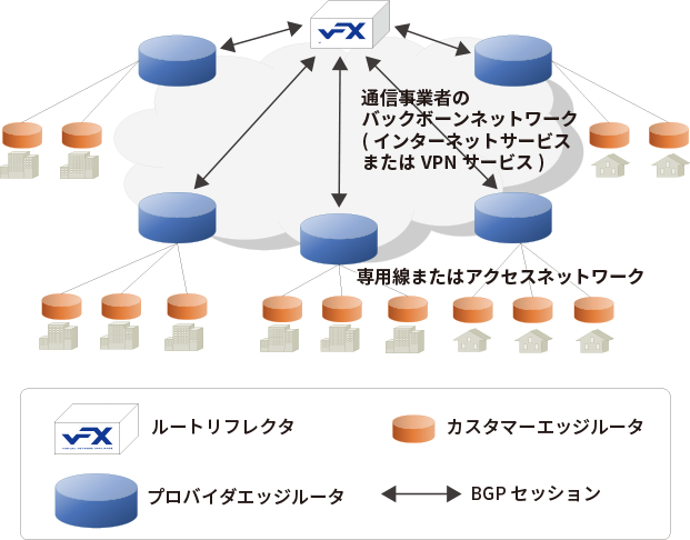 通信事業者のバックボーンネットワークにおけるインターネットサービス網やVPNサービス網で、BGP経路を集約する際に「vFX-R」を利用することができます。これにより、各ルータが保持すべきBGPセッションの数を減らすことで、各ルータにかかる負荷を軽減し、サービスの安定性強化と運用コストの削減を支援します。