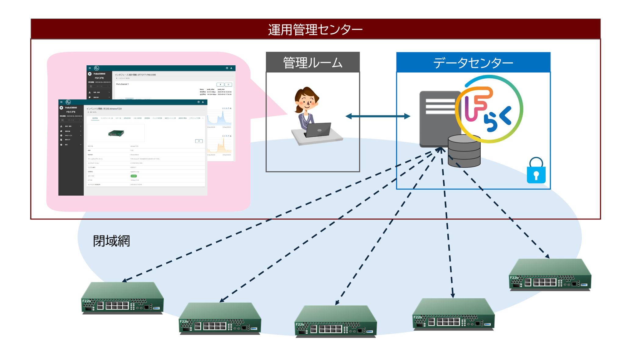 Fらくねっと®オンプレミス版は、ネットワークを構築する複数のFITELnetルータを、インターネットを介さずにお客様のネットワーク内で統合管理し、装置状態やトラフィック量の監視、機器の設定やファームウェアの履歴管理・一括変更などを管理画面上で簡単に安全に行うことができるサービスです。Fらくねっと®から各拠点に配置されたFITELnetルータを一元的に管理・監視することで、ネットワーク管理者の負担を大幅に軽減します。