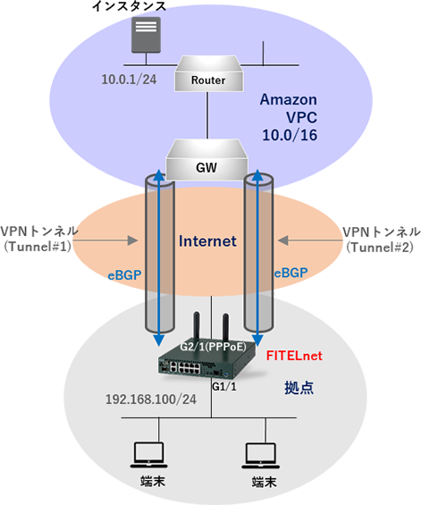 AWSコンソール手順書にしたがって、Amazon VPCおよびAmazon EC2(Amazon Elastic Compute Cloud)の設定を行えば、構成図のようにAmazon VPCとVPN接続して、インスタンスを利用することが可能です。