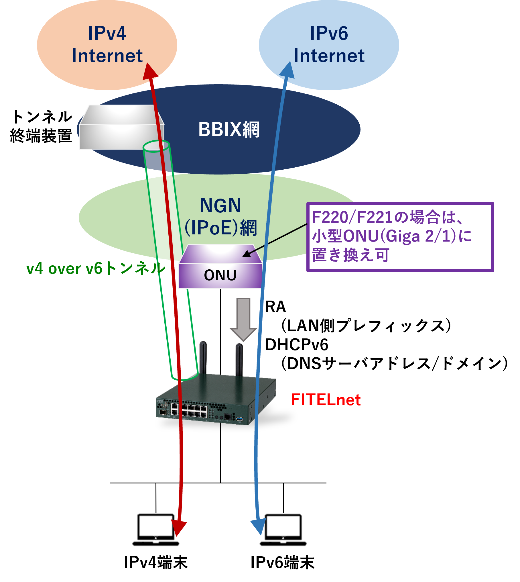 本設定例は、IPinIPのNAT機能が必要となりますので、F220/F221の場合はV01.03(00)以降のファームウェアをご使用ください。
