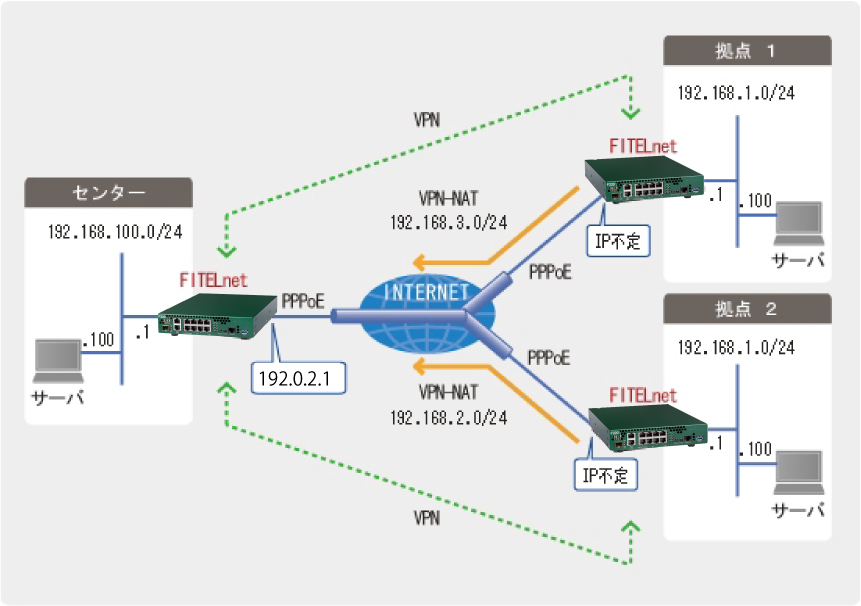 | IPsecの対象とする中継パケット(拠点1側) | 192.168.0.0/16 ← 192.168.3.0/24 |