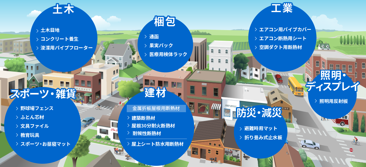 建築・土木用途、家電用途、自動車用途など幅広い分野で大活躍