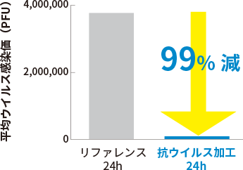 - 抗ウイルス効果は抗ウイルス性製品の表面に付着したウイルスに対し発現するものであり、空気中のウイルスに発現するものではありません。また、抗ウイルス効果は、感染予防を保証するものではありません。